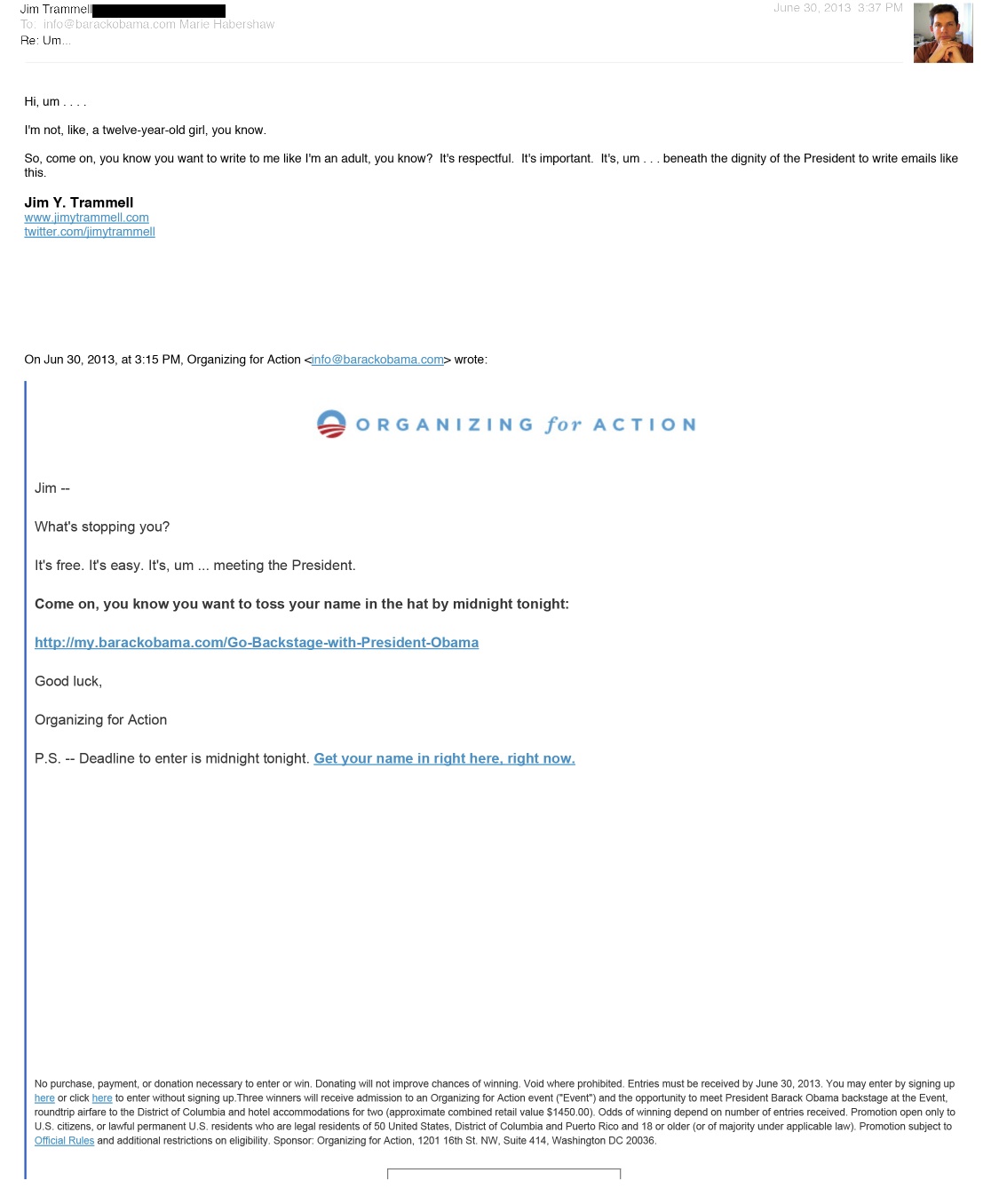 An email from Organizing for Action, and my response Uncategorized Share this: Click to share on Facebook (Opens in new window) Facebook Click to share on X (Opens in new window) X Like Loading... Related